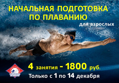 Только с 1 по 14 декабря 2025 года скидка на начальную подготовку по плаванию, для взрослых с 18 лет- 1800 рублей вместо 2900 рублей!